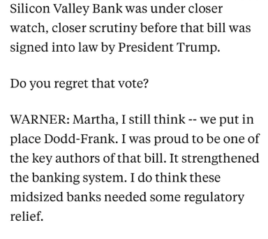 The cherry on this cake is that the VCs who created hysteria about a relatively minor banking issue might have finally stepped in it. Senator Warner's statement on the whole mess blames a "reckless run" on SVB by depositors. I am sympathetic to his anger. Legal systems can only work if reckless actors are punished and over the past few years social media-savvy investors have floated all kinds of laws with little consequence. However, let's not kid ourselves. You risk this when you deregulate a piece of the banking sector. So while I think many of the Twitter-active VCs acted irresponsibly and perhaps committed some actual crimes, when made examples of by the Senate Banking Committee and the SEC, they will be covering up for the more significant mistakes that got us here.